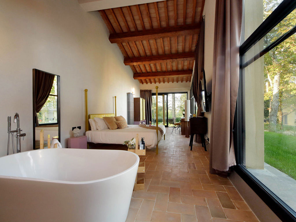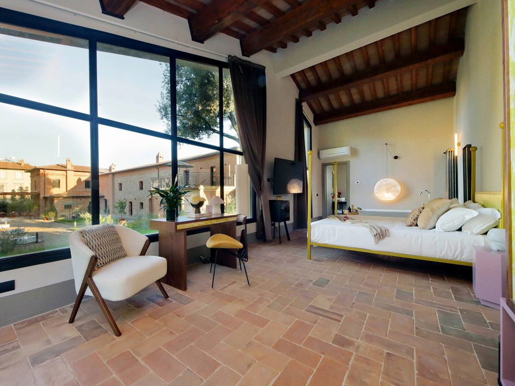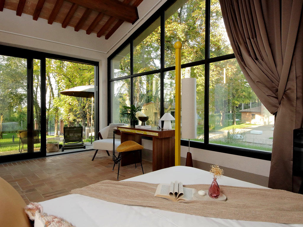 Ogni dettaglio, dal letto king size alla luce che filtra morbida attraverso i tendaggi, è pensato per creare un ritmo intimo e naturale, dove architettura, natura e comfort trovano un linguaggio condiviso.