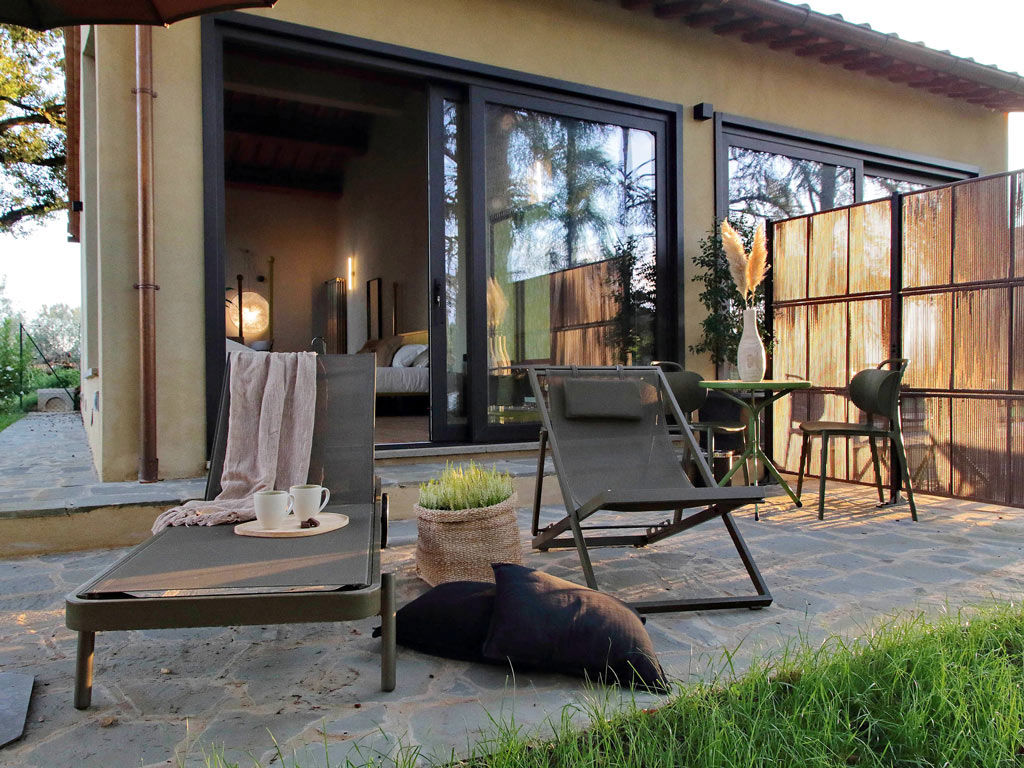 Progettata da STUDIOTAMAT, la Deluxe Serra si apre in 40 m² di luce e armonia. Le grandi vetrate si affacciano sul giardino comune, lasciando entrare il paesaggio e le sue sfumature cromatiche.
