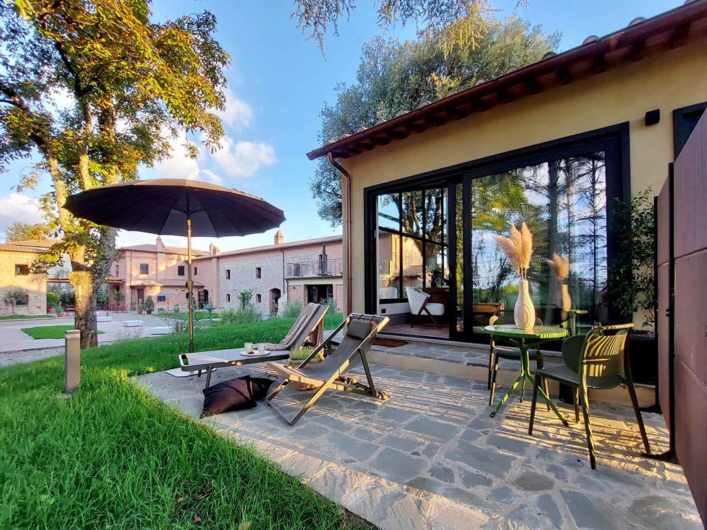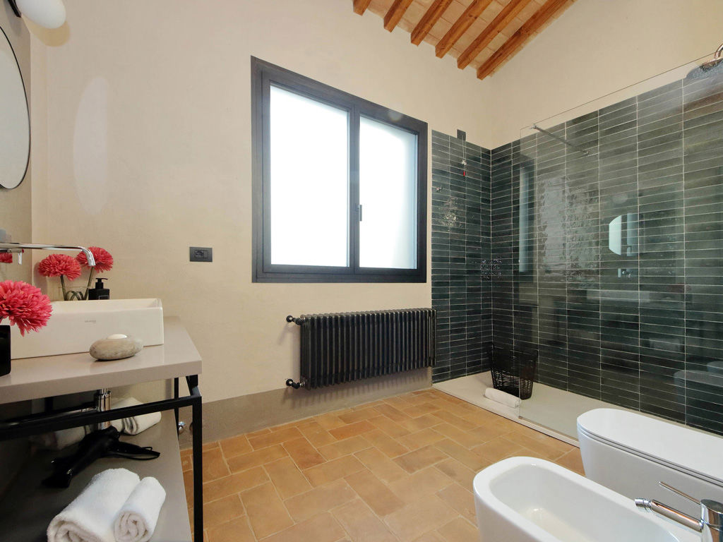 All’interno, il design contemporaneo si intreccia con la materia viva del legno e del ferro, in un equilibrio che riflette la cura artigianale e la sensibilità del territorio umbro. La vasca freestanding, protagonista dello spazio, invita a momenti di benessere, mentre l’ampia doccia walk-in e i toni caldi dei materiali restituiscono una sensazione di quiete.