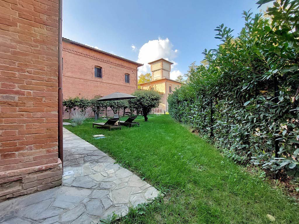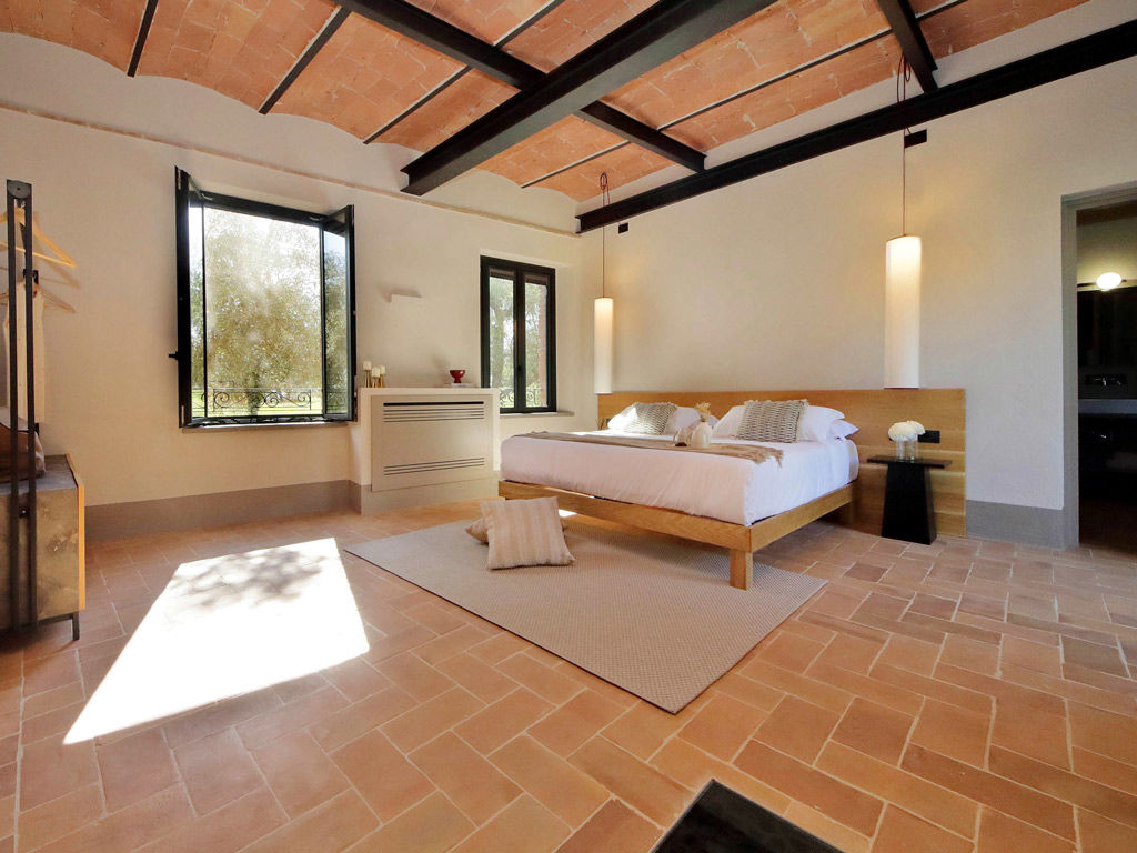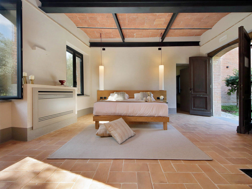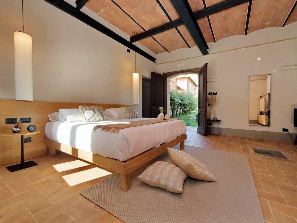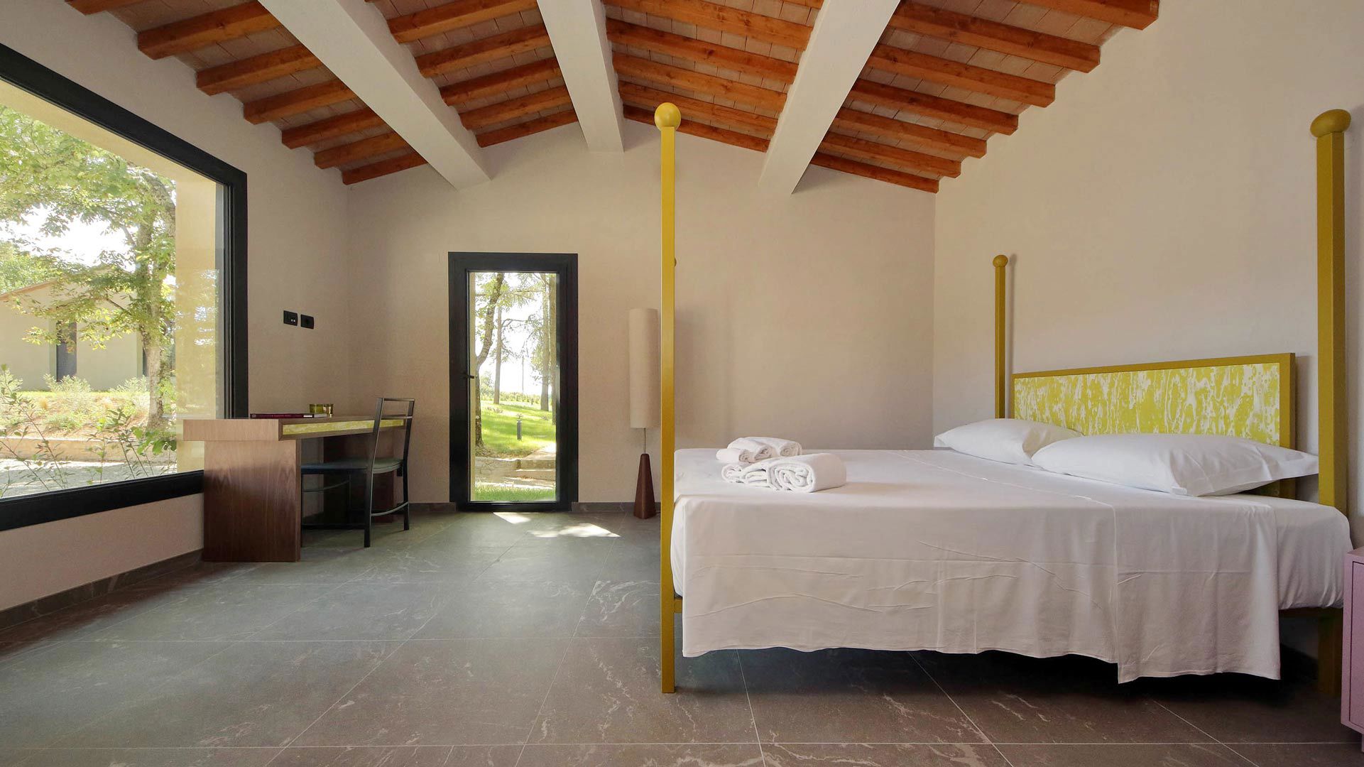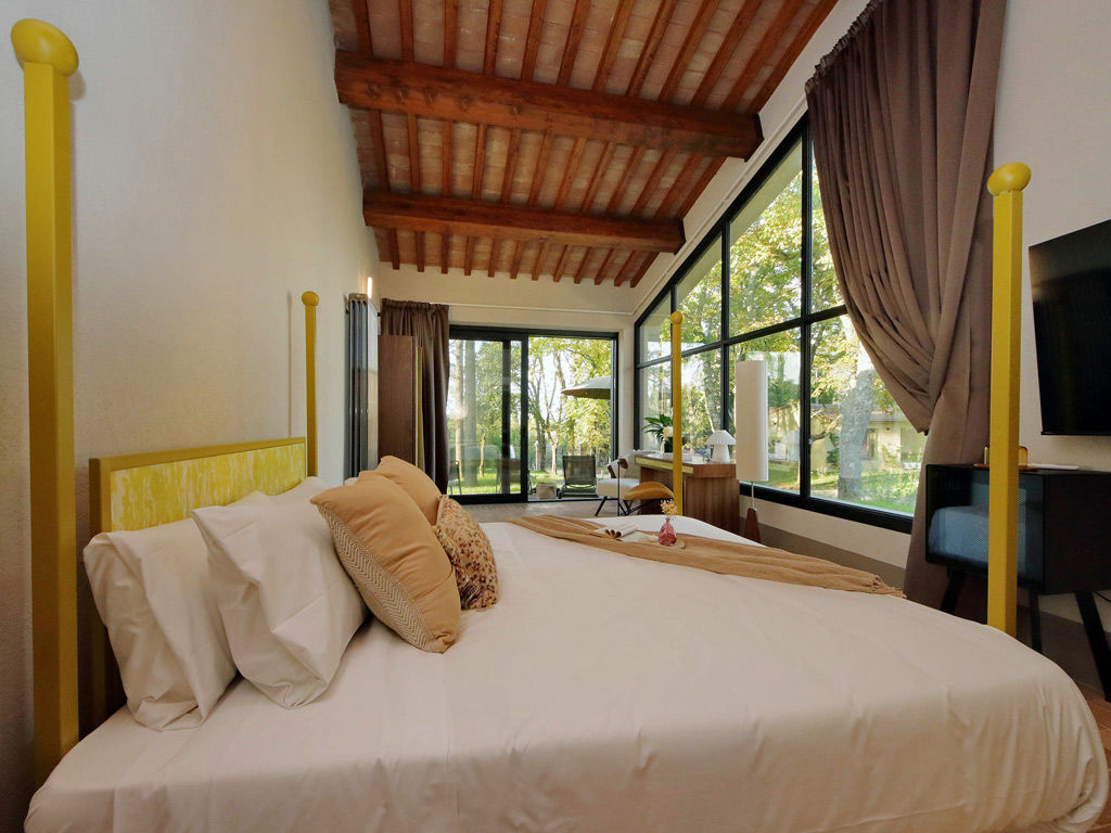 Il letto matrimoniale king size garantisce il massimo comfort per il vostro riposo. Dalle vetrate, lo sguardo si apre su una porzione privata di giardino, arredata con lettini, ombrellone, tavolo e sedie.