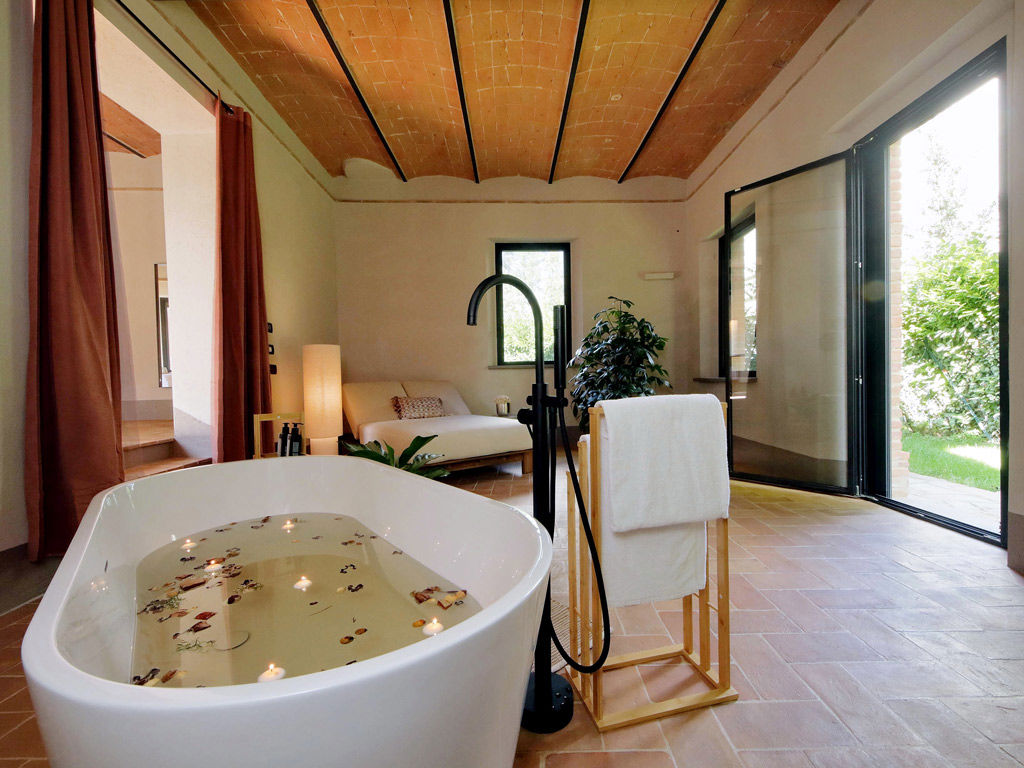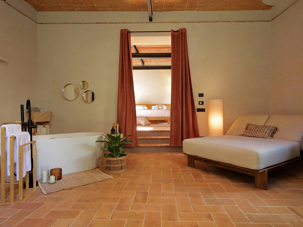 La particolarità della Garden Suite risiede nella stanza dedicata al relax: un ambiente luminoso e una vasca freestanding che invita a lunghi bagni rigeneranti e, accanto, unday bed matrimoniale che accoglie il corpo e la mente in una dimensione di tranquillità.