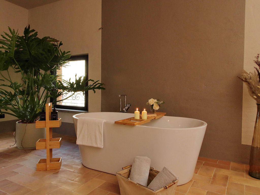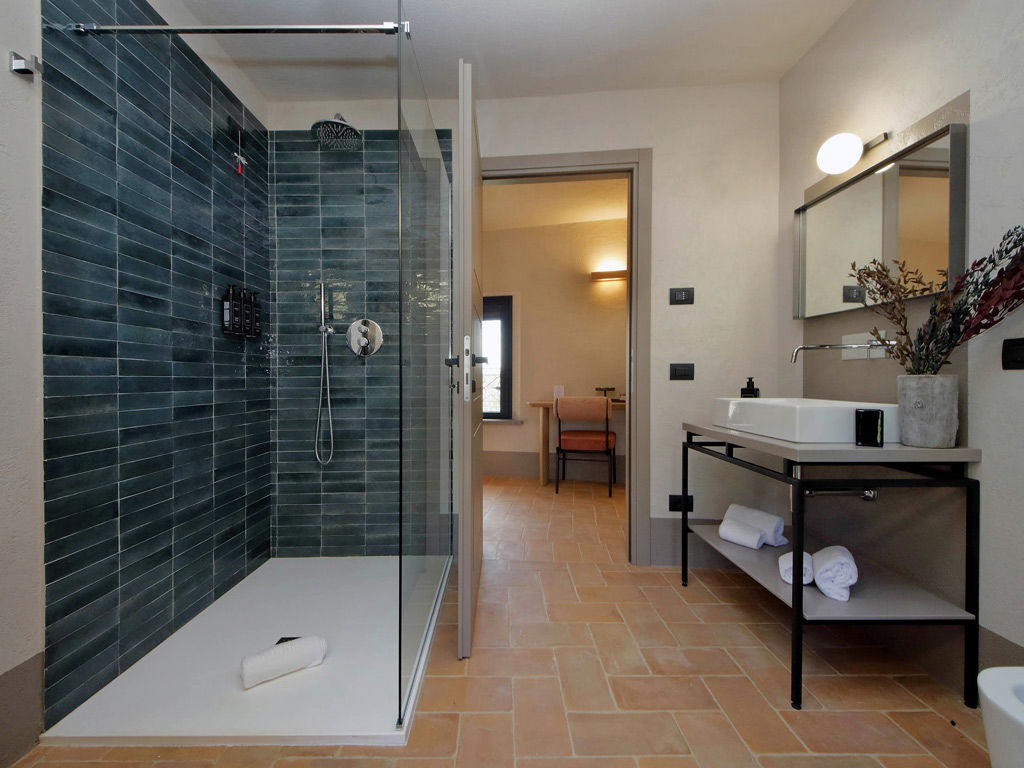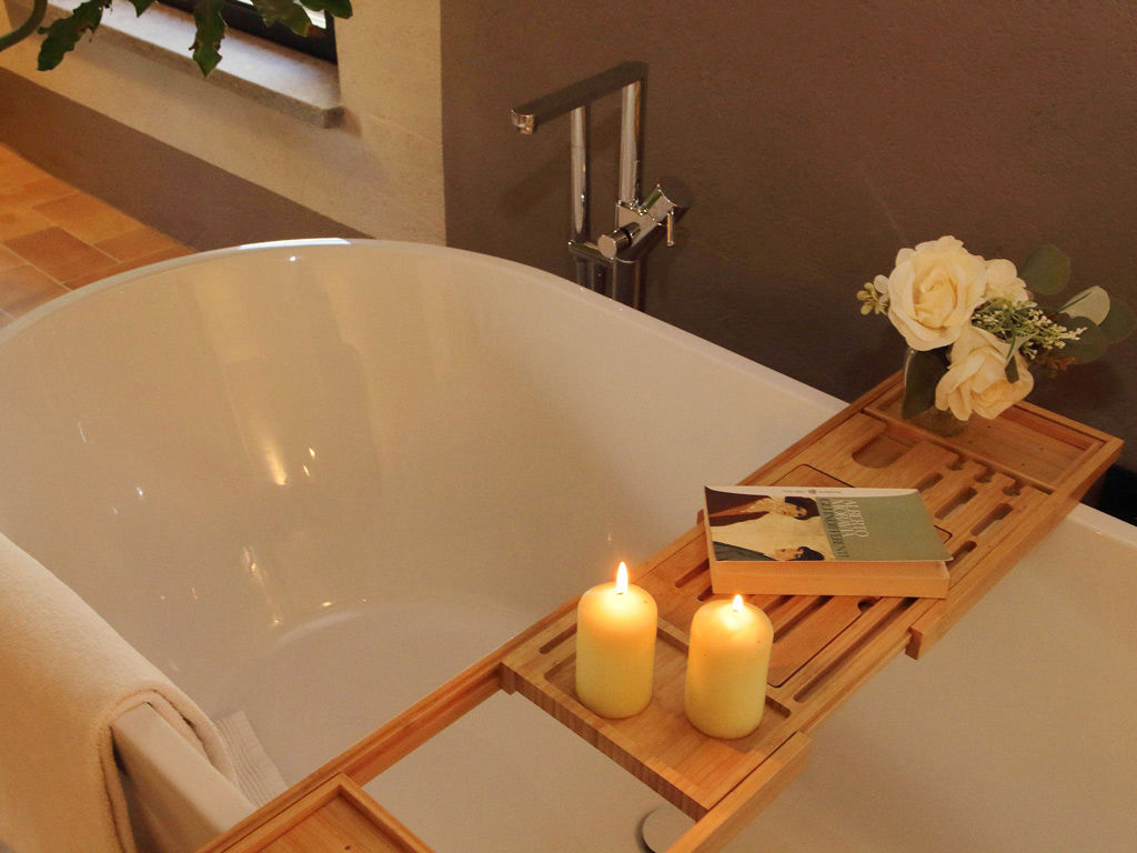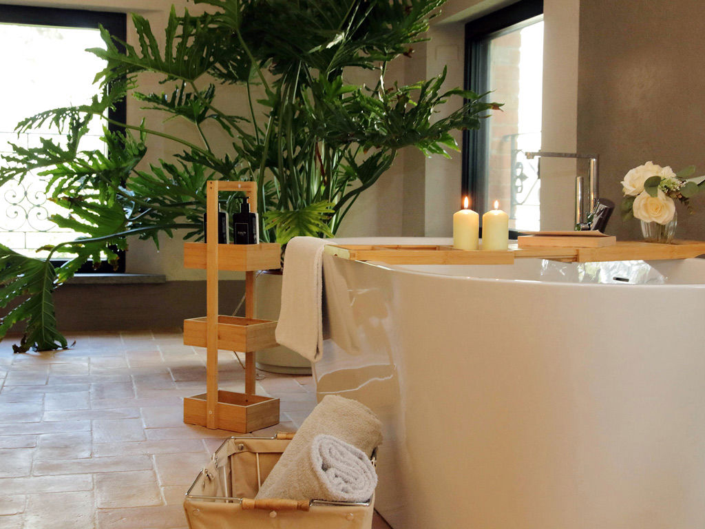 La stanza dedicata al relax è un piccolo mondo a parte: le grandi vetrate aprono lo sguardo sul verde, la vasca freestanding al relax, il day bed matrimoniale accoglie pensieri e lentezza. Tutto è pensato per restituire un senso di equilibrio e intimità.