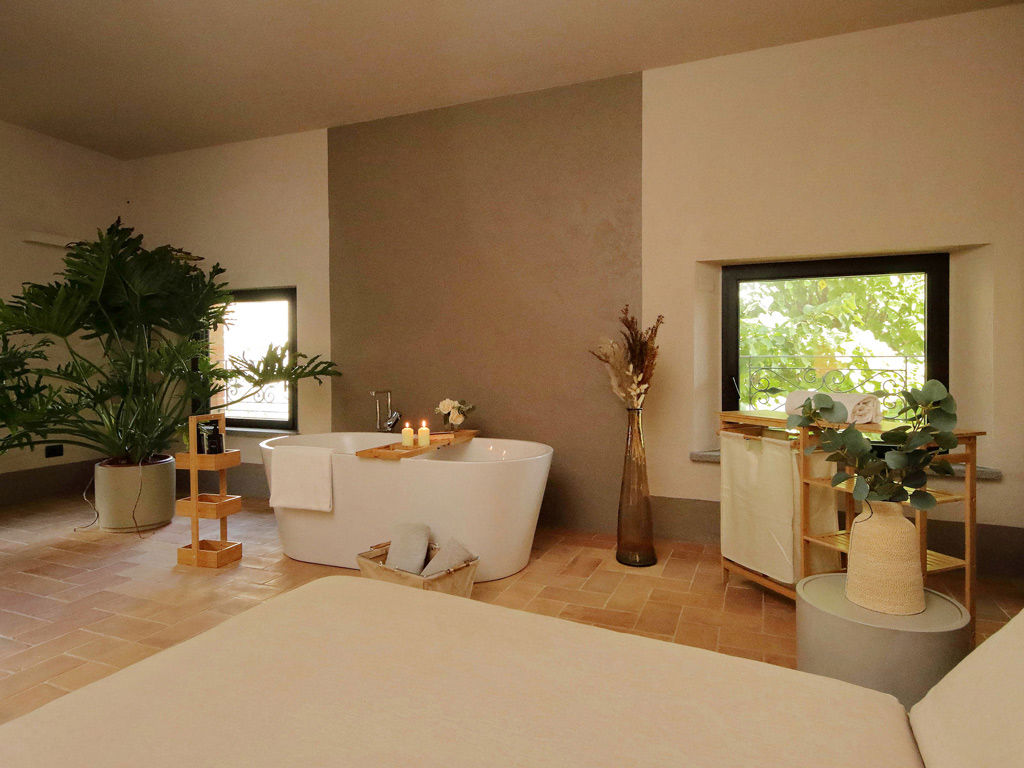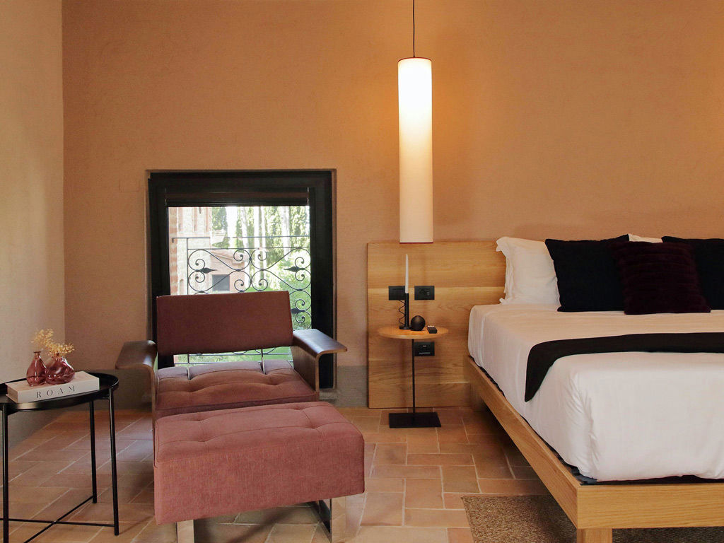 Un ampio corridoio introduce agli ambienti della Suite, definiti da linee pulite e materiali naturali. Nella zona notte, il letto king size invita a un riposo profondo, mentre la luce filtra attraverso le tende leggere, accarezzando i tessuti e le superfici in un gioco morbido di ombre.