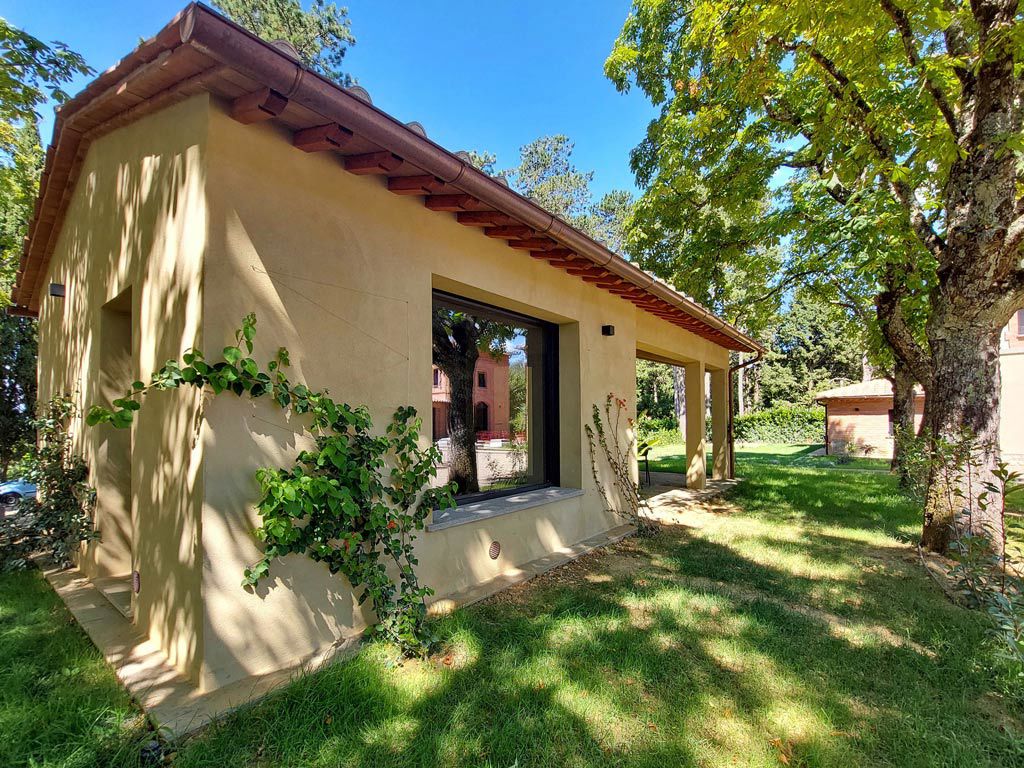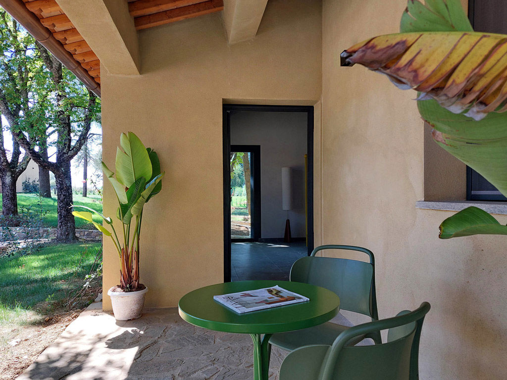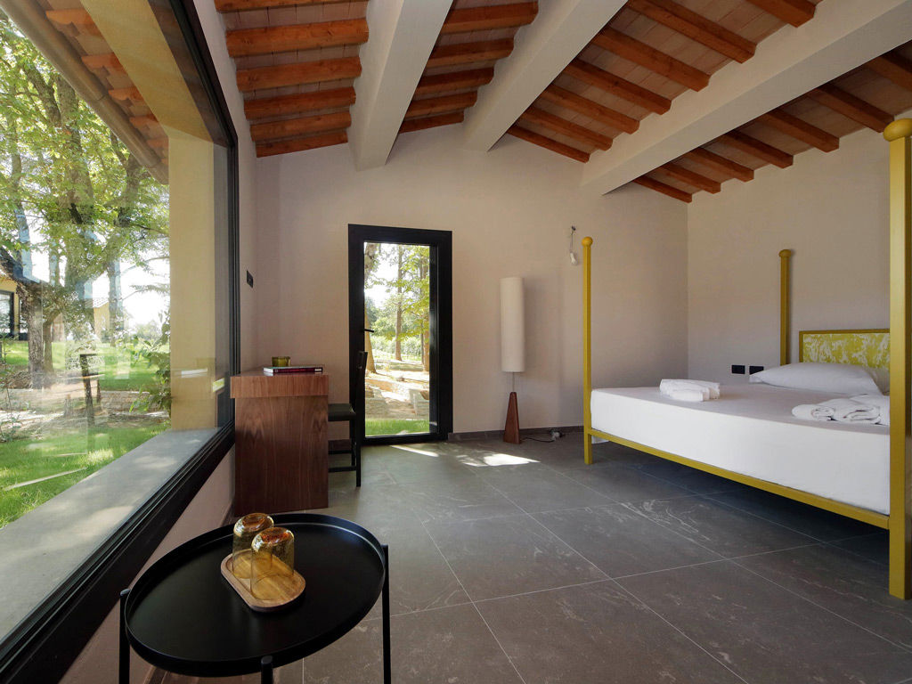 Il ferro e il legno, lavorati da artigiani locali, dialogano con la luce che entra dalle grandi vetrate che aprono lo sguardo sul giardino: linee pulite, materiali autentici, una bellezza essenziale che si manifesta con semplicità.